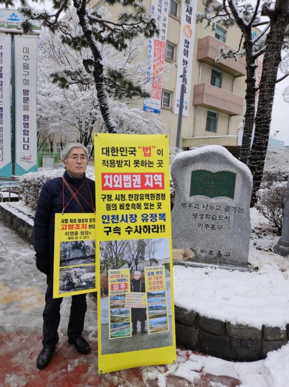 눈도 오고 추운날씨였지만 정의가 살아 있음을 보여 주기 위해 부산에서 인천으로 올라가 인천경찰청 앞과 인천 미추홀구청 앞에서 엄정한 법집행을 주장하며 일인시위를 하였다.