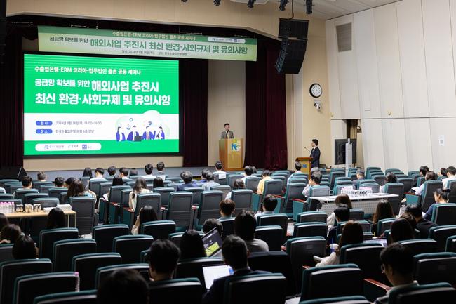 한국수출입은행은 26일 여의도 수은 본점에서 ERM코리아(글로벌 환경·사회 컨설팅社), 법무법인 율촌과 공동으로 `해외사업 추진시 최신 환경·사회 규제 및 유의사항` 세미나를 개최했다고 밝혔다.