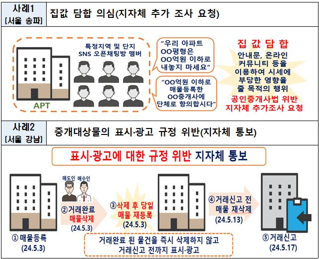 특히, 주택거래에서 집값 담합 의심사례도 다수 포착됐다. 서울 송파구의 한 아파트 단지에서는 오픈채팅방을 통해 특정 가격 이하로 중개를 의뢰하지 않도록 유도한 정황이 발견되어 지자체에 추가 조사가 요청됐다. 또 다른 사례로는 강남구의 한 아파트 거래에서 공인중개사가 광고를 반복 삭제하고 재등록한 정황이 포착돼, 중개대상물 표시 광고 규정을 위반한 것으로 조사됐다.