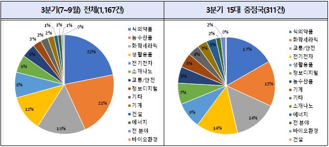 중국은 생활용품, 전기안전 관련 기술규제 등 43건을 통보했으며, 사우디아라비아는 식품, 가전기기 관련 등 23건을 통보하며 지난 분기 대비 3배 가까이 증가했다.