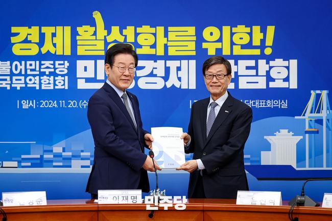 이재명 당대표가 2024.11.20.(수) 국회 본청 당대표회의실에서 열린 민생경제 간담회에 참석하여 윤진식 한국무역협회 회장과 악수하며 기념 촬영을 하고 있다. 이재명 더불어민주당 대표는 11월 20일 국회 본청 당대표회의실에서 윤진식 한국무역협회 회장 및 임원진을 접견하며, 수출 중심 경제의 중요성과 현안 해결을 위한 정치권의 지원 필요성을 강조했다.