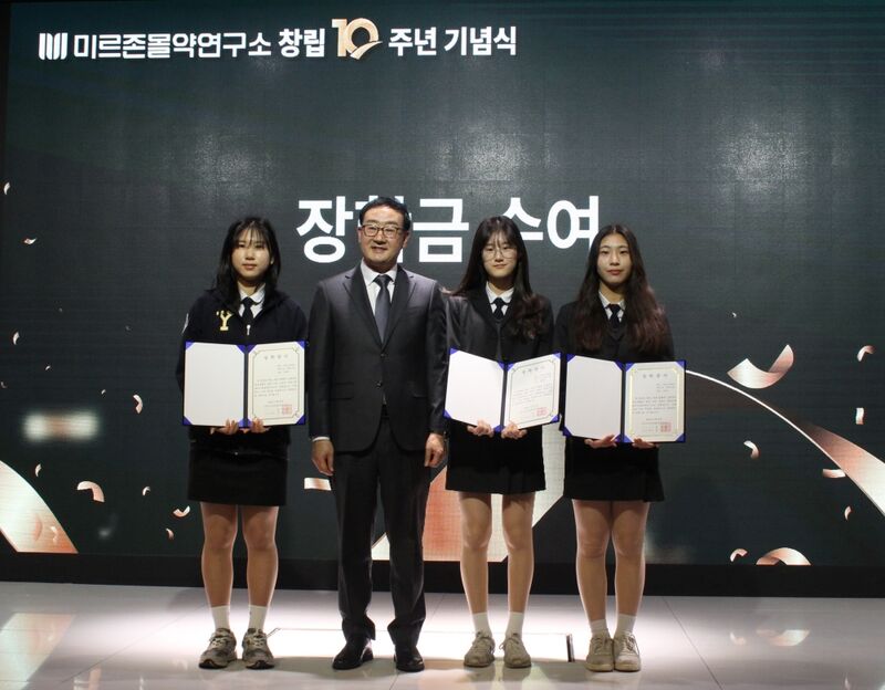 (사진)창립 10주년 맞은 미르존몰약연구소 김진우 소장이 양서고등학교 학생들에게 장학금 전달하다