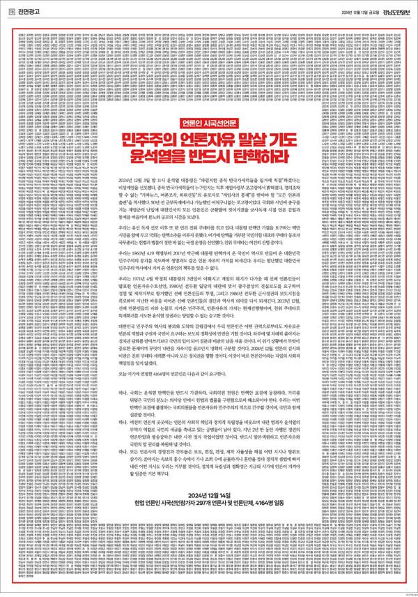 윤석열 탄핵 촉구, 언론인 4천여 명 시국선언 발표 - “민주주의 붕괴 막아야” 탄핵 표결 동참 촉구 - 전국 297개 언론단체 참여…언론 자유 수호 결의
