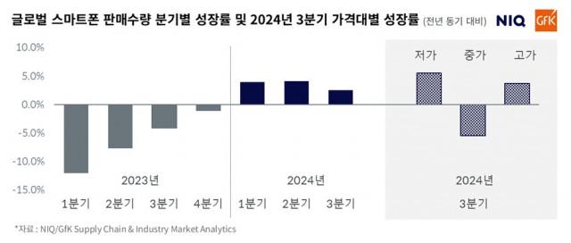 GfK, 2024년 3분기 전 세계 스마트폰 판매량 3% 증가 - 2024년 7~9월의 세계 스마트폰 판매량은 상반기에 이어 전년 대비 3% 증가, 저가형과 고가형 스마트폰이 주도 - 2024년은 전년 대비 소폭 증가, 2025년은 전년과 비슷한 판매량 예측