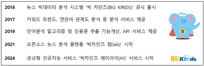 문화체육관광부와 한국언론진흥재단은 3월 24일, 국내 최대 뉴스 분석 시스템인 ‘빅카인즈(Big KINDS)’를 인공지능 기반의 뉴스 서비스로 전면 개편했다고 밝혔다. 개편 소식은 4월 7일 ‘신문의 날’을 맞아 대대적으로 알릴 예정이다.