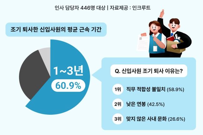 HR테크기업 인크루트는 인사 담당자 446명을 대상으로 신입사원 조기 퇴사에 관한 설문조사를 실시한 결과, 응답 기업의 60.9%가 신입사원이 입사 후 1~3년 내 퇴사한다고 답했다. 이어 ▲4개월~1년 미만(32.9%), ▲3개월 이하(6.3%) 순으로 나타났다.