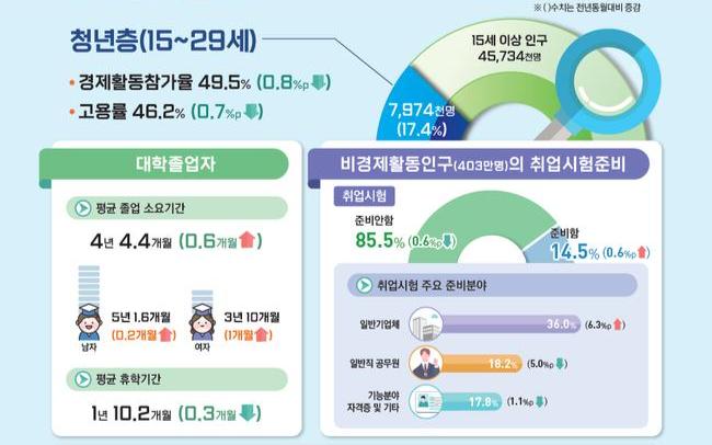 2025년 5월 기준 청년층(15~29세) 고용률이 46.2%를 기록하며 전년보다 0.7%포인트 하락한 것으로 나타났다. 취업자 수는 368만 2,000명으로 15만 명 감소했고, 청년층 인구도 전년 동월 대비 20만 명 줄었다.