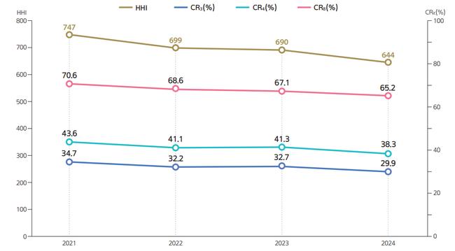 위원회에 따르면 2024년 허핀달-허쉬만 지수(HHI)는 644로, 2021년 747보다 낮아졌다. 상위 3개 매체계열의 여론영향력 점유율(CR3)은 29.9%, 상위 8개 매체계열(CR8)은 65.2%로, 각각 2021년 34.7%, 70.6%보다 줄어 특정 매체계열의 독점적 영향력이 완화된 것으로 나타났다.