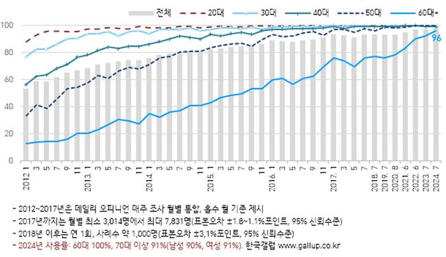 스마트폰 사용률이 90%대에 접어든 시기는 저연령일수록 일렀다. 2012년 상반기 20대, 그해 하반기 30대, 2014년 40대, 2016년 50대, 2022년 60대 이상 순으로 90%를 돌파했다.