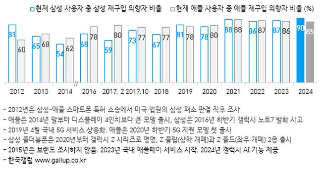 10년 전인 2014년 삼성·애플 재구입 의향률은 60% 내외였다. 애플은 2016~2018년 재구입 의향률 80% 내외 유지, 같은 기간 삼성은 오르내림 폭이 컸다. 2019년 이후로는 양사 비슷해졌고, 2021년부터 재구입 의향률이 각각 90%에 육박한다.