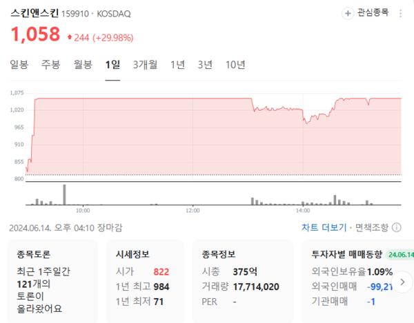 "6월14일의 스킨앤스킨 종목 현황"  네이버 종목정보 캡쳐