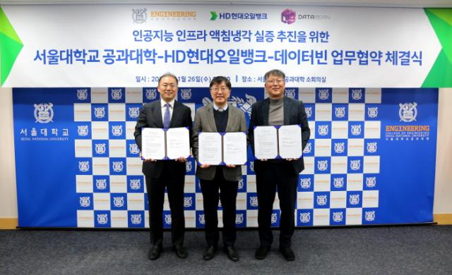 서울대학교 공과대학은 26일 관악캠퍼스에서 HD현대오일뱅크 및 액침냉각 시스템 운영업체 데이터빈과 함께 `인공지능 인프라 액침냉각 실증 프로젝트` 양해각서(MOU)를 체결했다. 왼쪽부터 HD현대오일뱅크 윤활유사업본부장 정태오 전무, 서울대학교 공과대학 김영오 학장, 데이터빈 김수용 대표