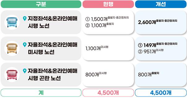 아울러, 많은 중간 정차지나 긴 도심 내 운행구간 등으로 중간정차지 별 도착시간 준수가 어려워 온라인 예매제 시행이 현실적으로 어려운 자율좌석제 노선(800개)은 출발지에서라도 온라인 예매 서비스를 시행한다.