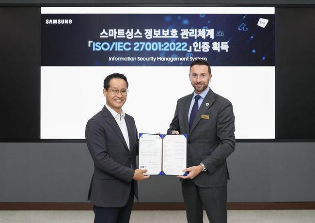 삼성전자 스마트싱스(SmartThings)가 `정보보호 관리체계`에 대한 국제표준 ISO/IEC 27001:2022 인증을 영국왕립표준협회(BSI)로부터 받았다. 삼성전자 디지털플랫폼센터장 최승범 부사장(왼쪽)과 영국왕립표준협회 해롤드 프라달(Harold Pradal) 인증 서비스 부문장(오른쪽)이 삼성전자 디지털시티에서 기념촬영을 하고 있다.