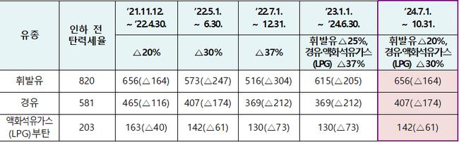 유류세 탄력세율 인하조치 2개월 연장...올해 10월 말까지 - 2024.10.31.까지 휘발유 20%, 경유·액화석유가스(LPG)부탄 30% 인하 유지 - `교통・에너지・환경세법 시행령` 및 `개별소비세법 시행령` 개정안 입법예고