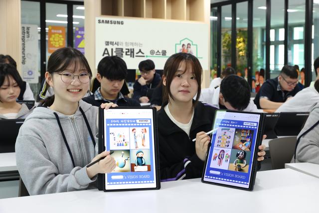 인천 아라고등학교에서 진행된 `갤럭시와 함께하는 AI 클래스 @스쿨`에서 학생들이 갤럭시 AI를 활용한 진로 비전보드 만들기 프로그램을 체험하는 모습