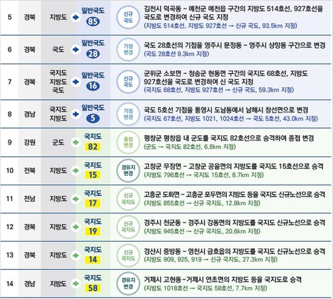전국 7개 지역의 지자체 관리 도로 14개 노선이 국도 및 국가지원지방도로로 승격되며, 지역 간 연결성과 도로의 간선 기능이 한층 강화된다.