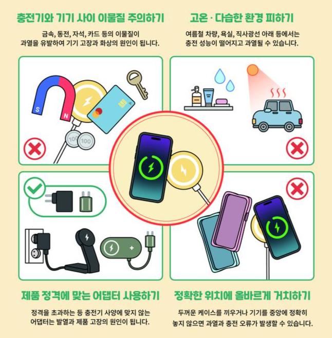 이에 따라 ▲충전기와 기기 사이 이물질이 끼지 않도록 주의할 것 ▲고온·다습한 장소는 피할 것 ▲제품 정격에 맞는 어댑터 사용 ▲정확한 위치에 기기를 올려 둘 것 등 4가지 안전 수칙을 제시하며, 사용자의 각별한 주의를 당부했다.