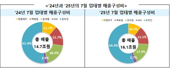 7월 주요 유통업체 매출 9.1% 증가…편의점·백화점 플러스 전환 - 오프라인 2.7%·온라인 15.3% 동반 상승, 소비쿠폰 효과 가시화 - 대형마트는 여전히 부진, 준대규모점포 5개월 연속 성장세 - 상품군별로는 식품·서비스·명품 강세…온라인 서비스 매출 25% 급증