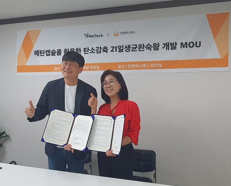 메텍홀딩스(MeTech Holdings, 대표 박찬목)가 사료 유통 전문기업 한중에스에스(대표 이경희)와 함께 친환경 축산 생태계를 공동으로 만들기 위해 MOU(업무협약)를 체결했다고 2일 밝혔다.