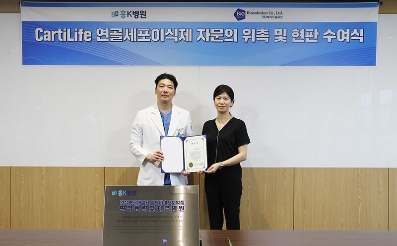 이번 행사에서는 흥케이병원 김종근 대표원장이 바이오솔루션의 공식 자문의로 위촉되었고 현판 수여식이 함께 진행됐다. 김종근 대표원장은 그동안 연골재생이식술 분야에서 풍부한 임상 경험과 연구 성과를 쌓아온 국내 대표 정형외과 전문의다. 이번 위촉을 통해 카티라이프를 비롯한 차세대 연골재생치료제의 임상 적용과 연구 개발 과정에 적극적으로 참여하게 된다. 이는 흥케이병원이 국내외 학계 및 바이오 업계와의 의료혁신의 중심 병원으로 자리매김하는 중요한 발판이 될 것으로 기대된다.