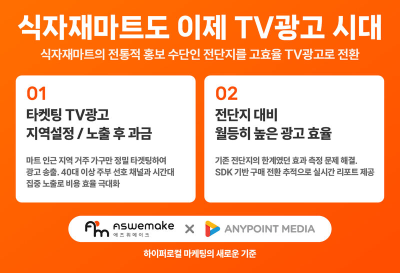 이번 협약은 식자재마트의 전통적인 홍보 수단인 전단지를 디지털 데이터 기반의 고효율 TV 광고로 전환하기 위해 추진됐다. 양사는 애즈위메이크의 하이퍼로컬 네트워크와 애니포인트미디어의 광고 플랫폼을 결합해 마케팅 패러다임을 바꾼다는 계획이다.